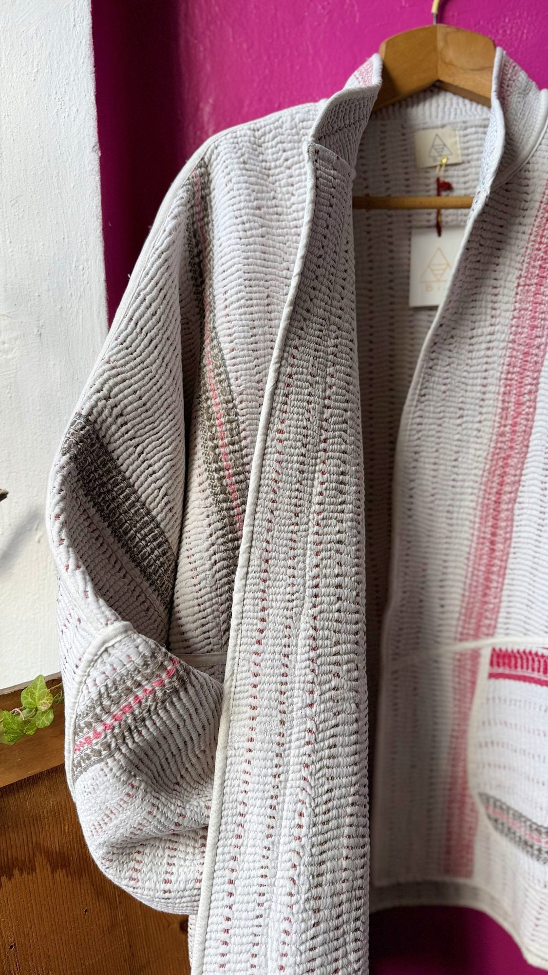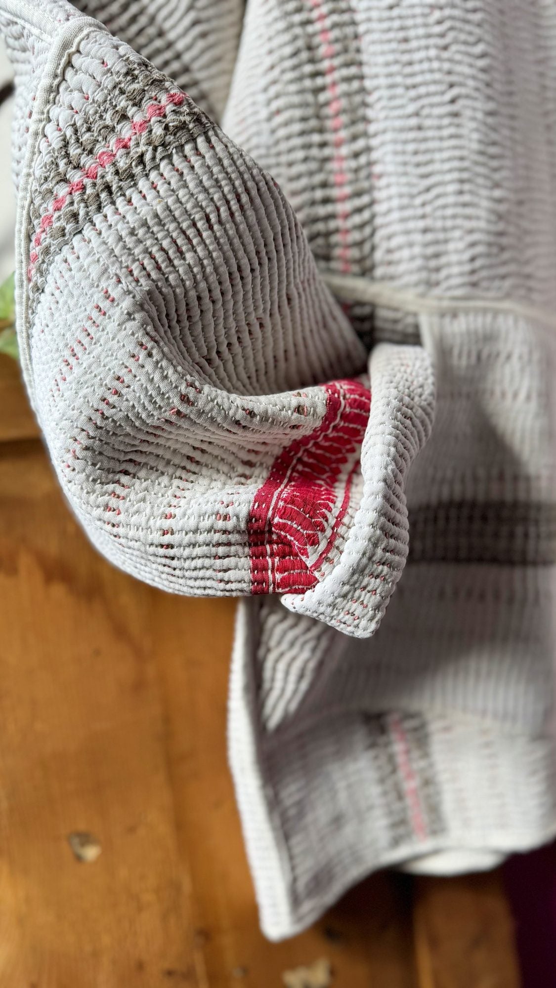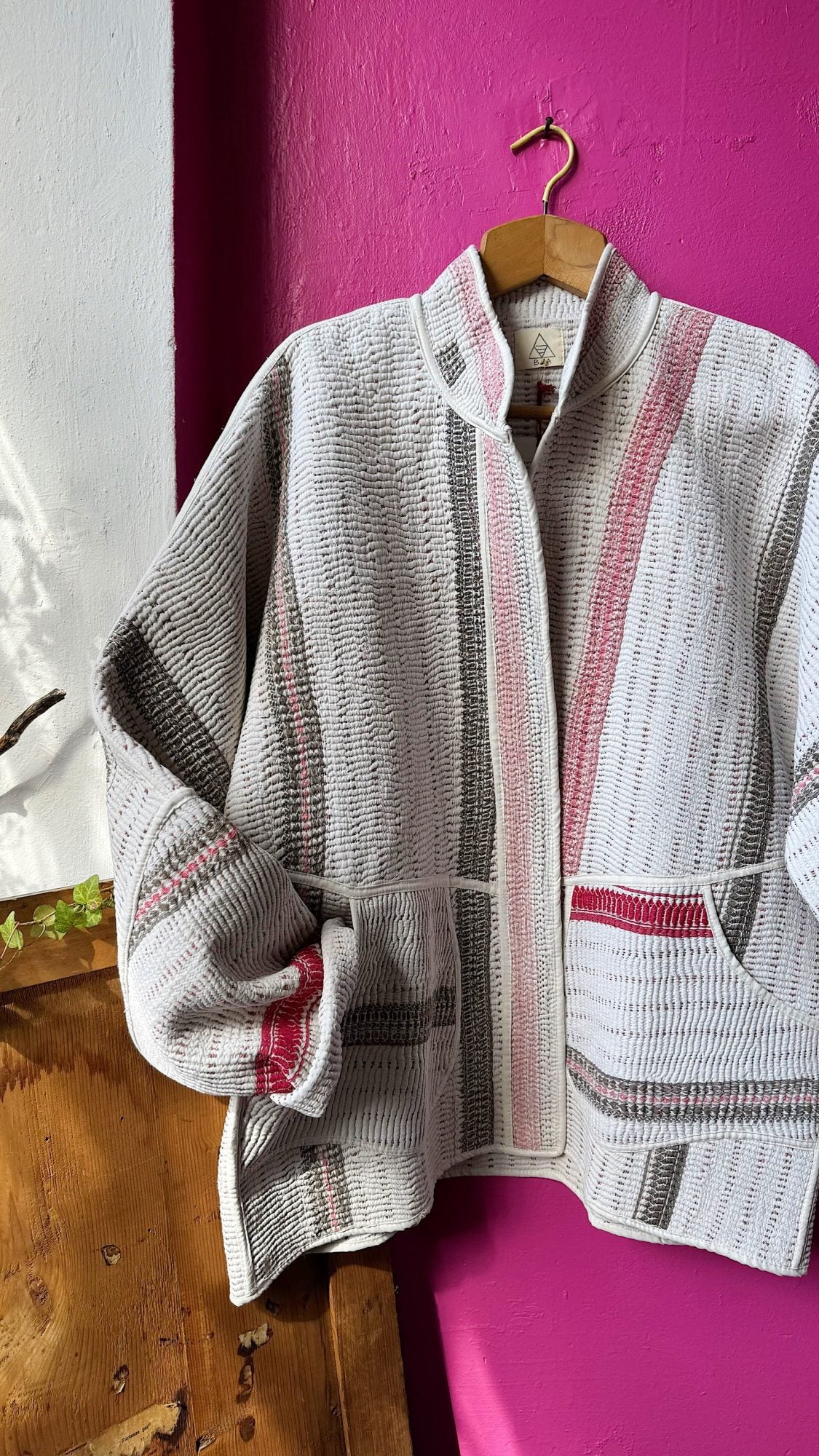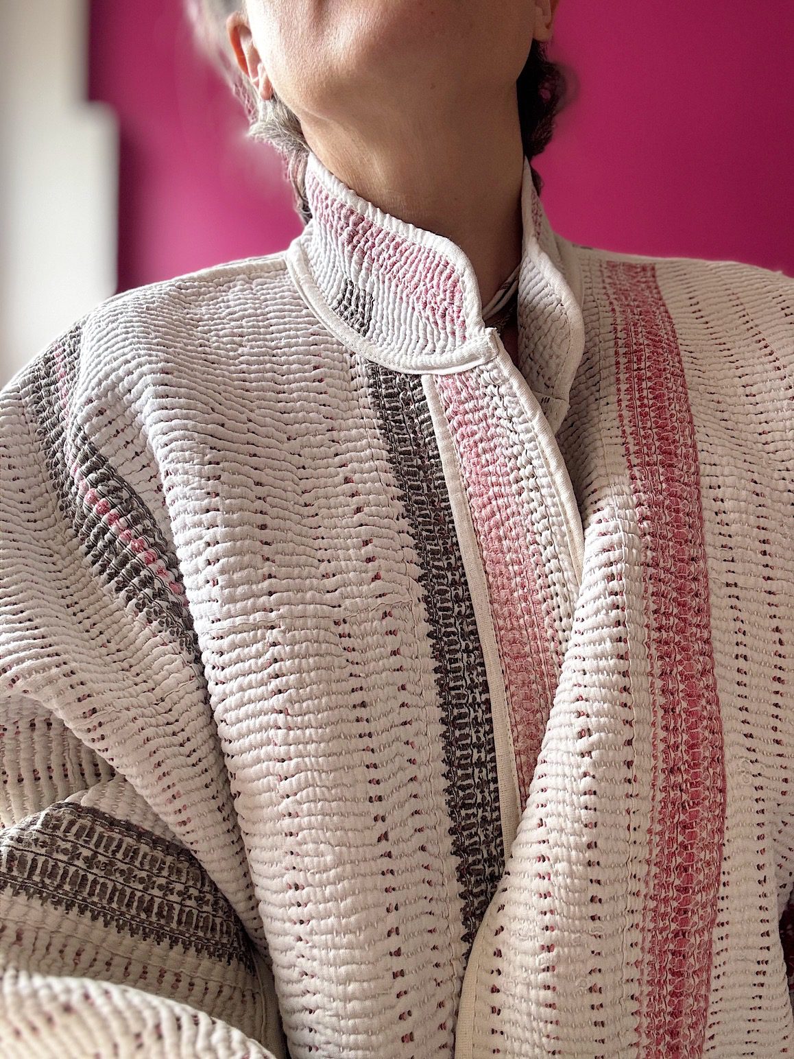 Creata con l’uso di una coperta kantha di cotone dalla tipica impuntura fitta e parallela.. più i punti sono fitti più la coperta vale; pezzi unici e irripetibili “consumati” ad arte dal tempo, altro valore aggiunto inimitabile;