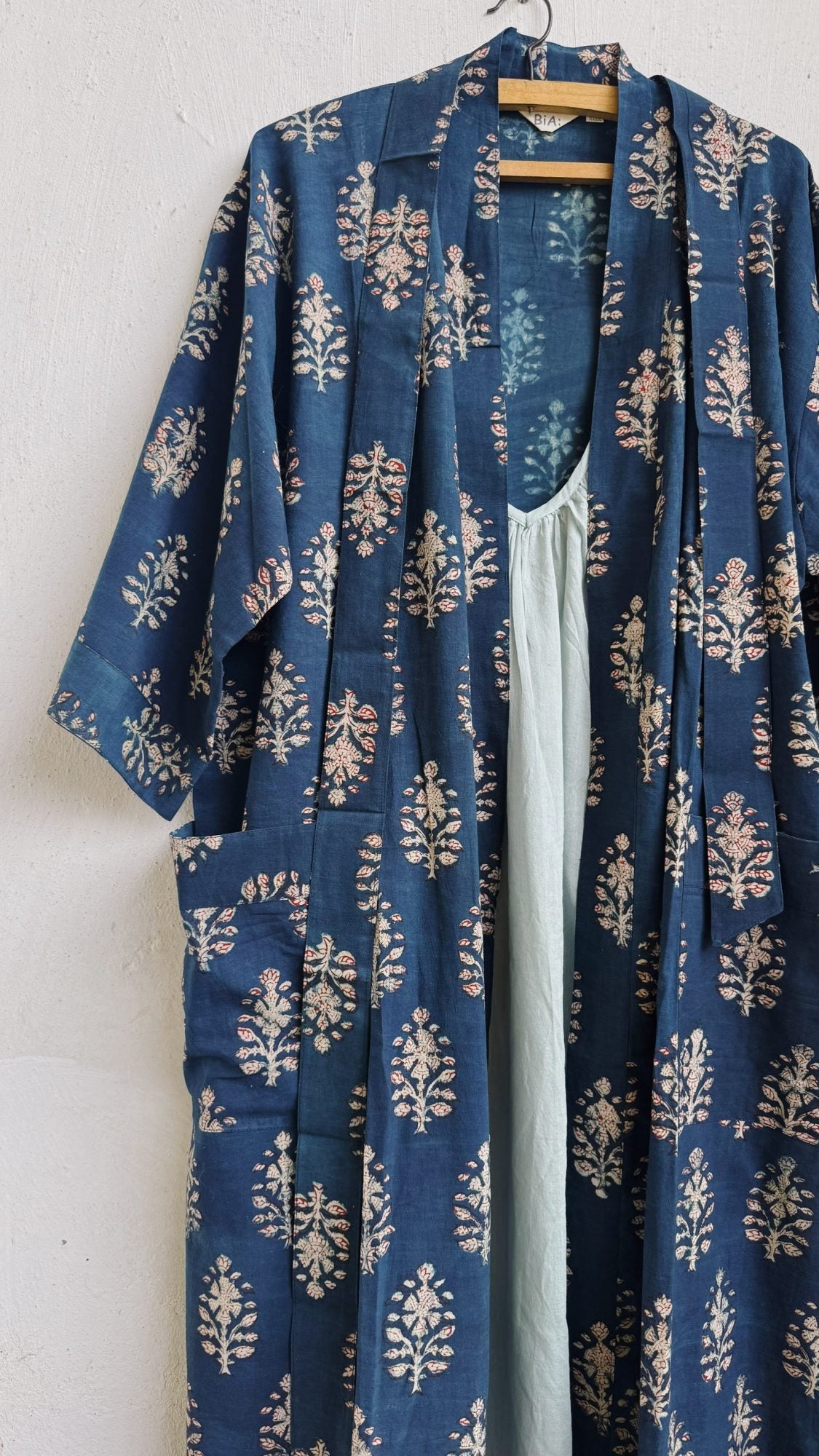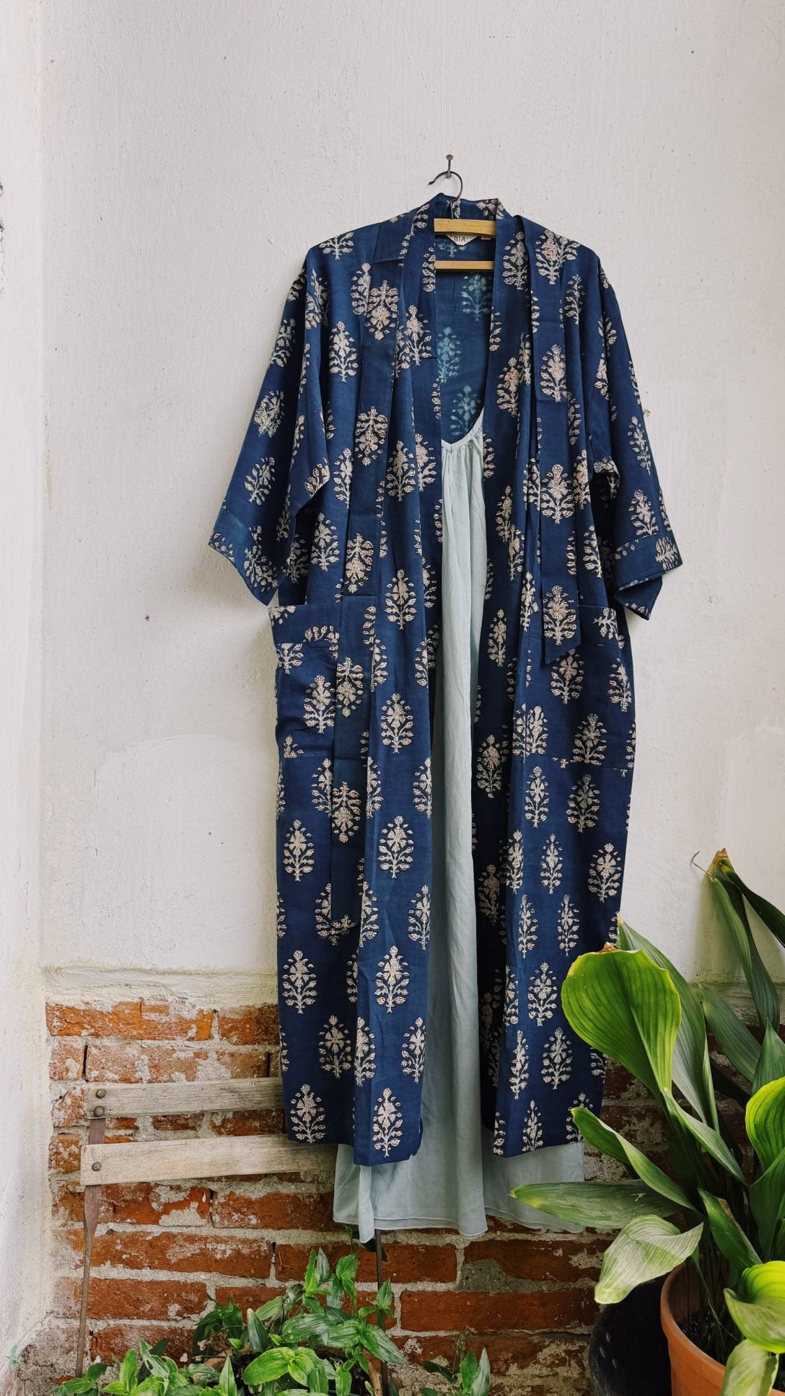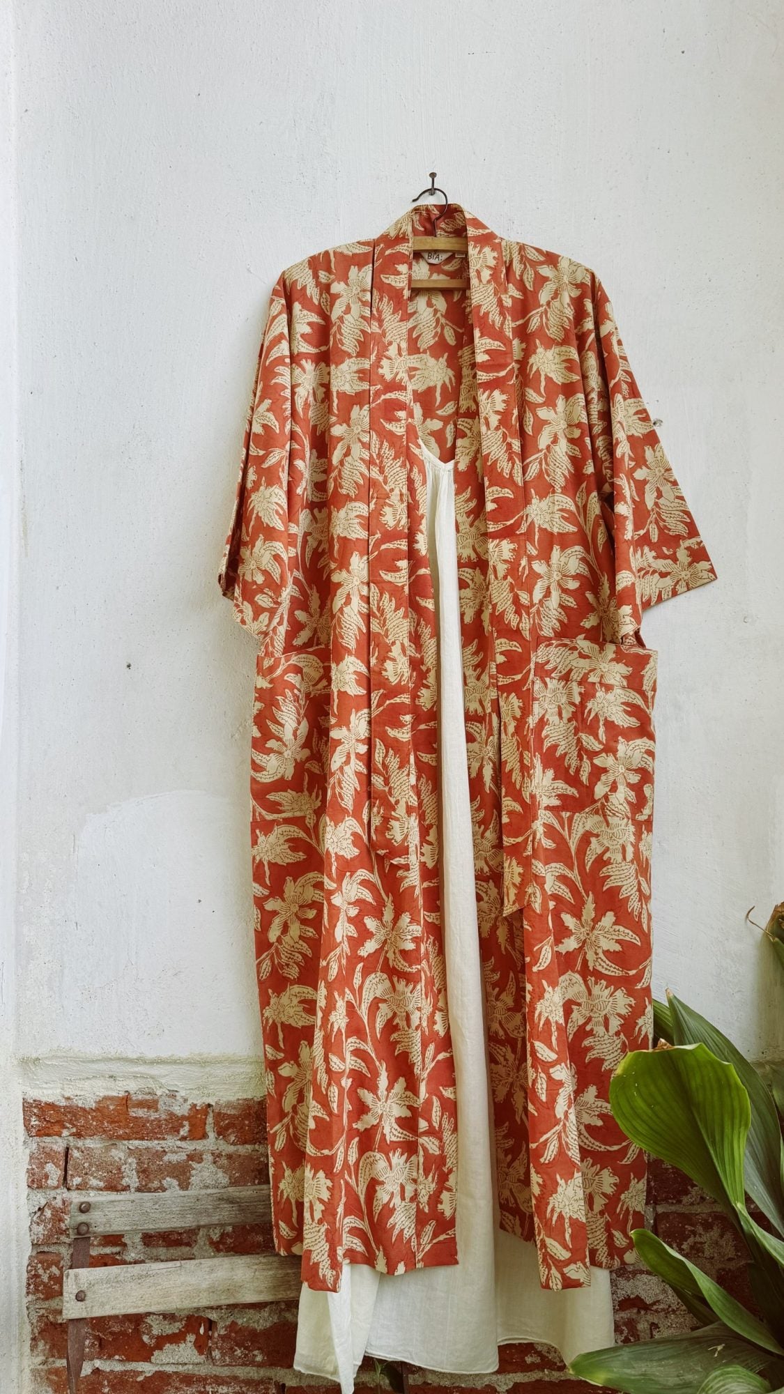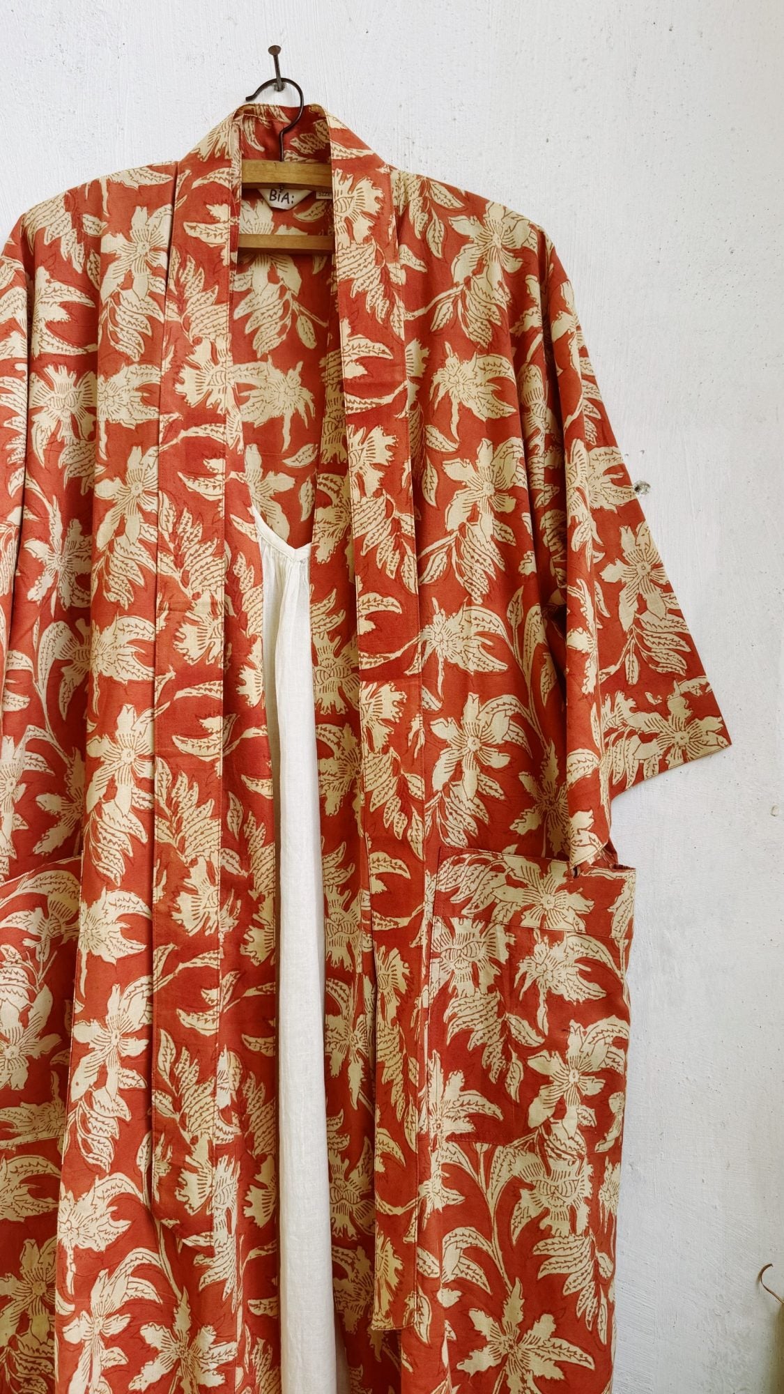 Long kimono in cotone stampato a mano