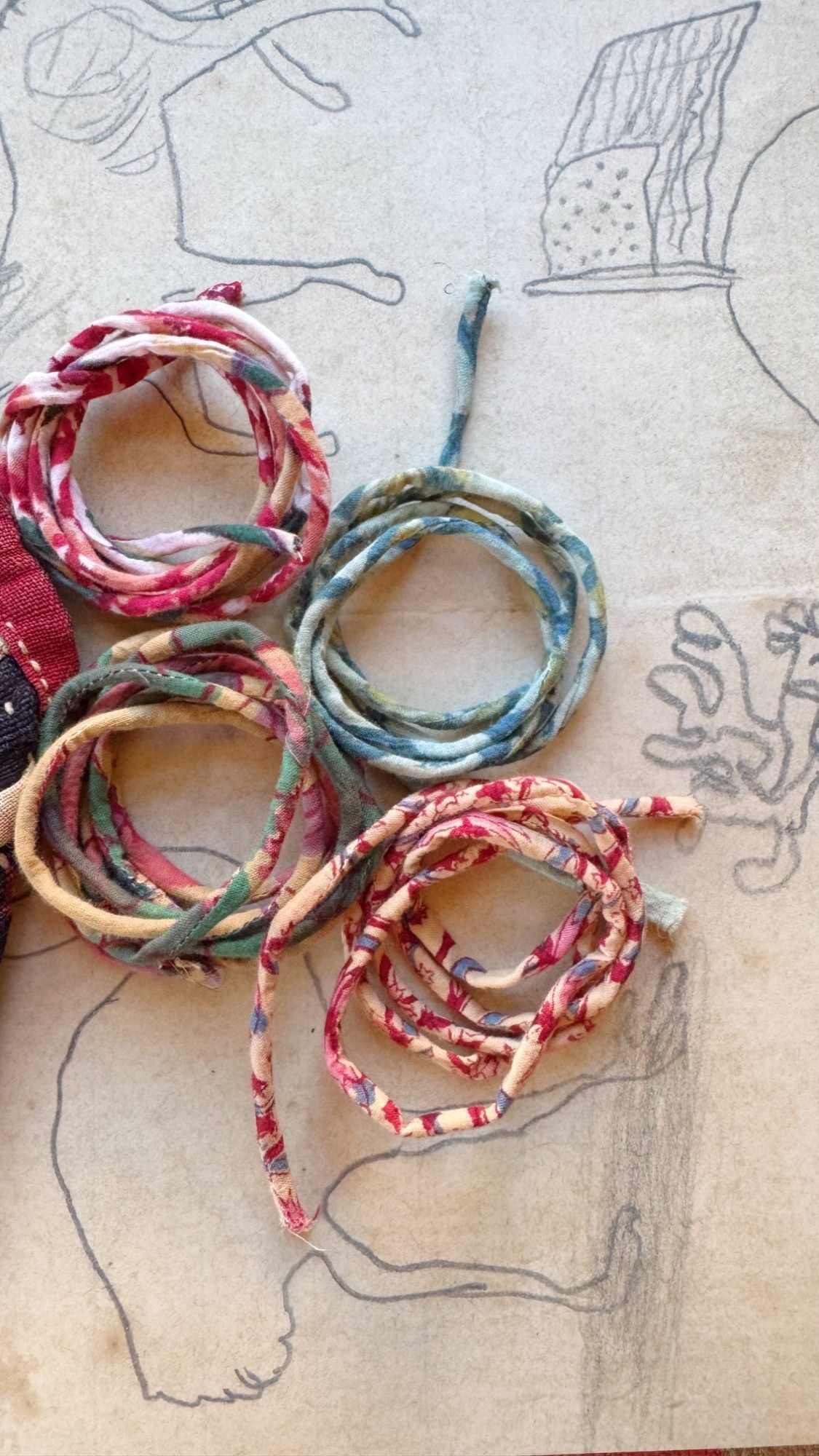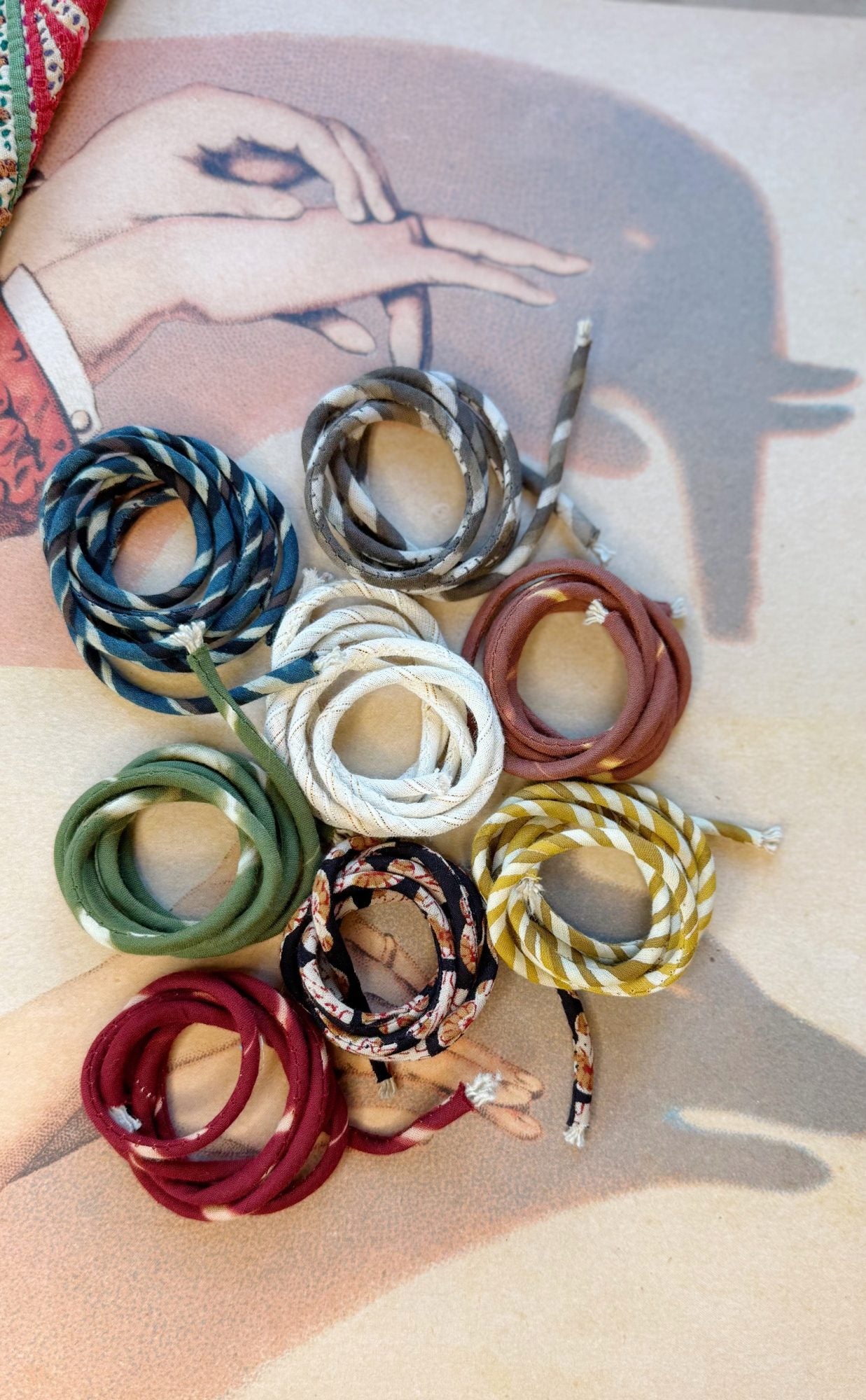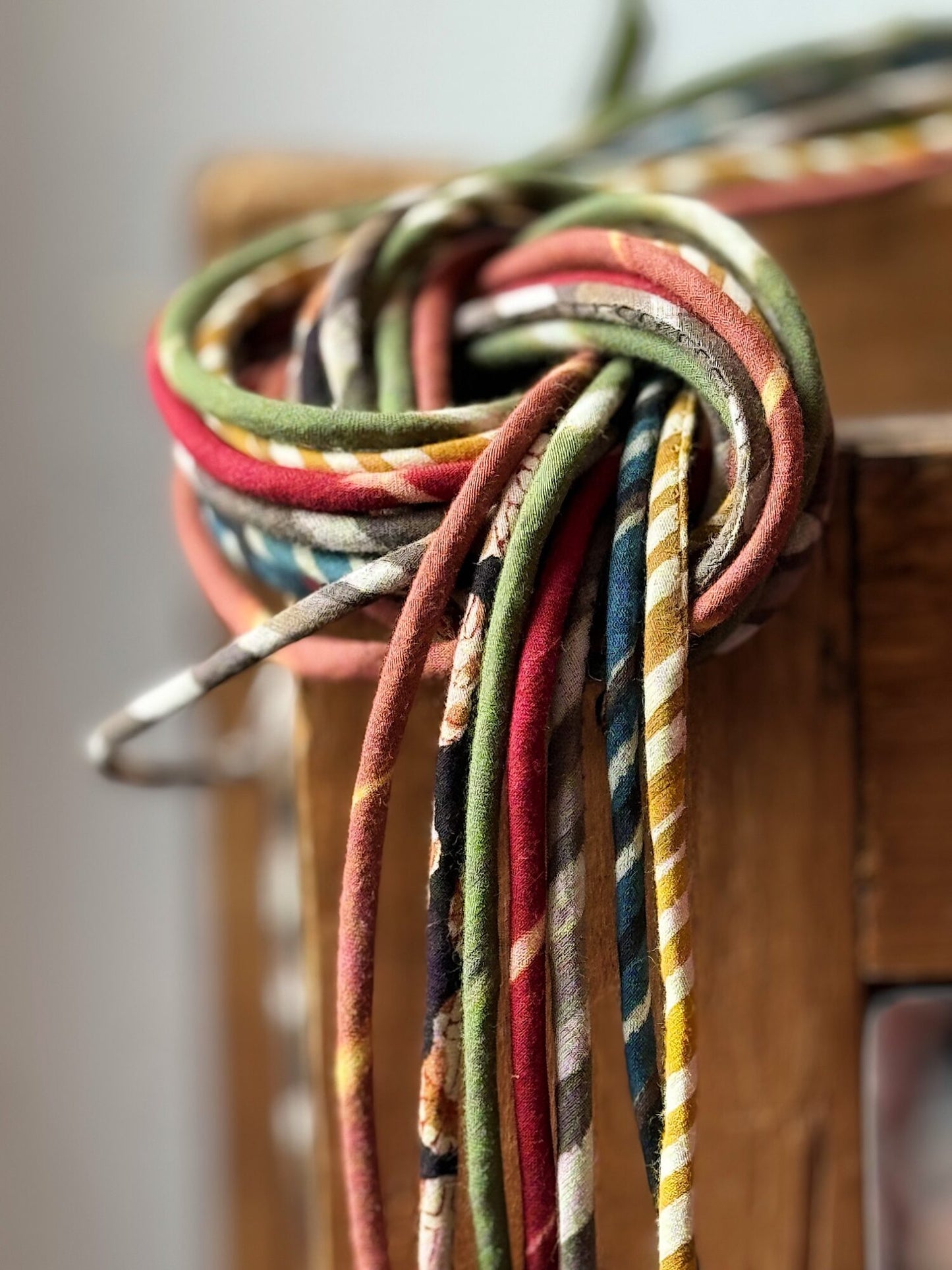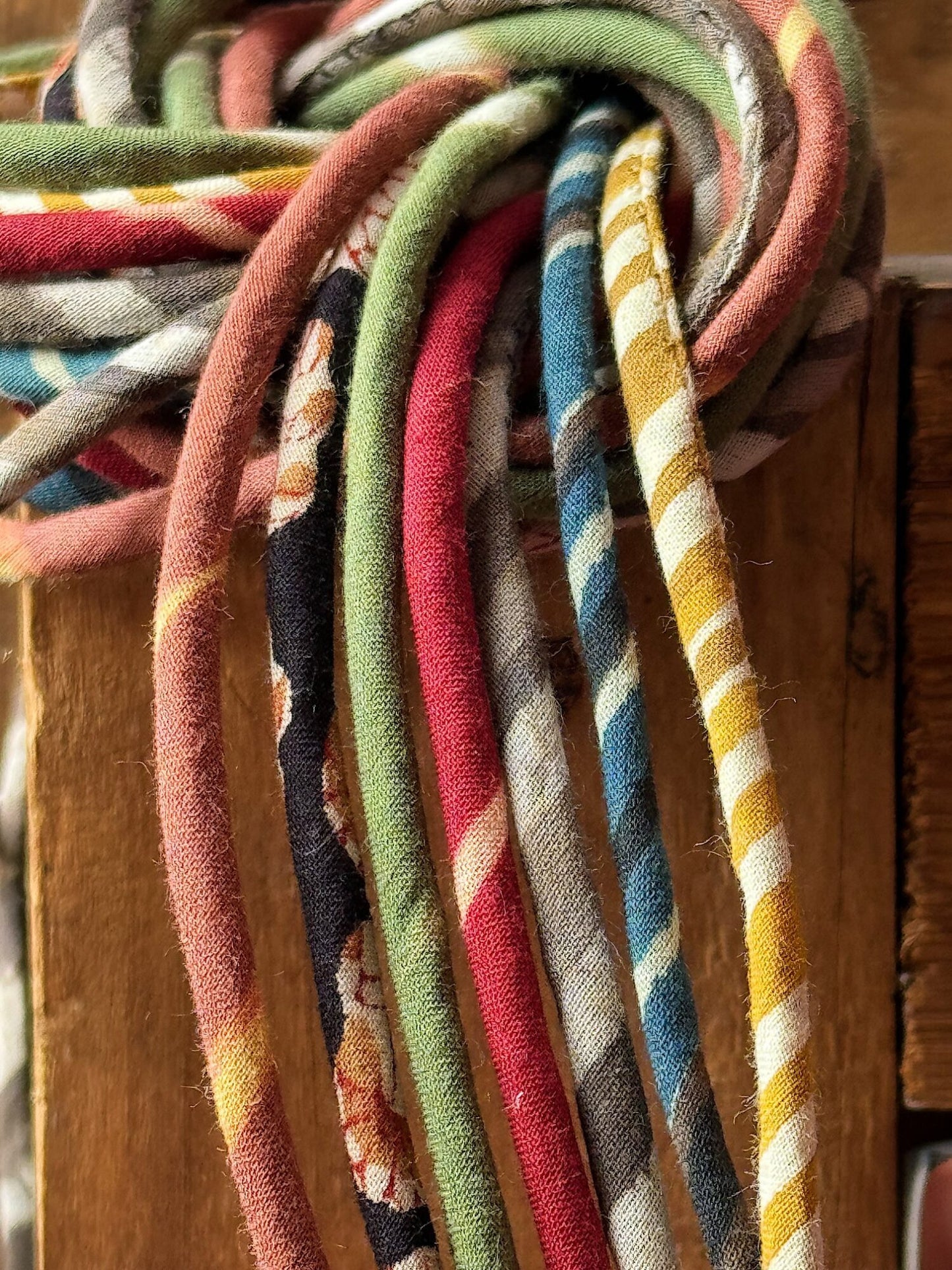Sono cordini di cotone lunghi circa 60/80cm, dipende di volta in volta dal materiale usato, molto spesso scampoli di cotone recuperati dopo le mie lavorazioni o materiale scovato in giro per Jaipur dai miei vari fornitori.