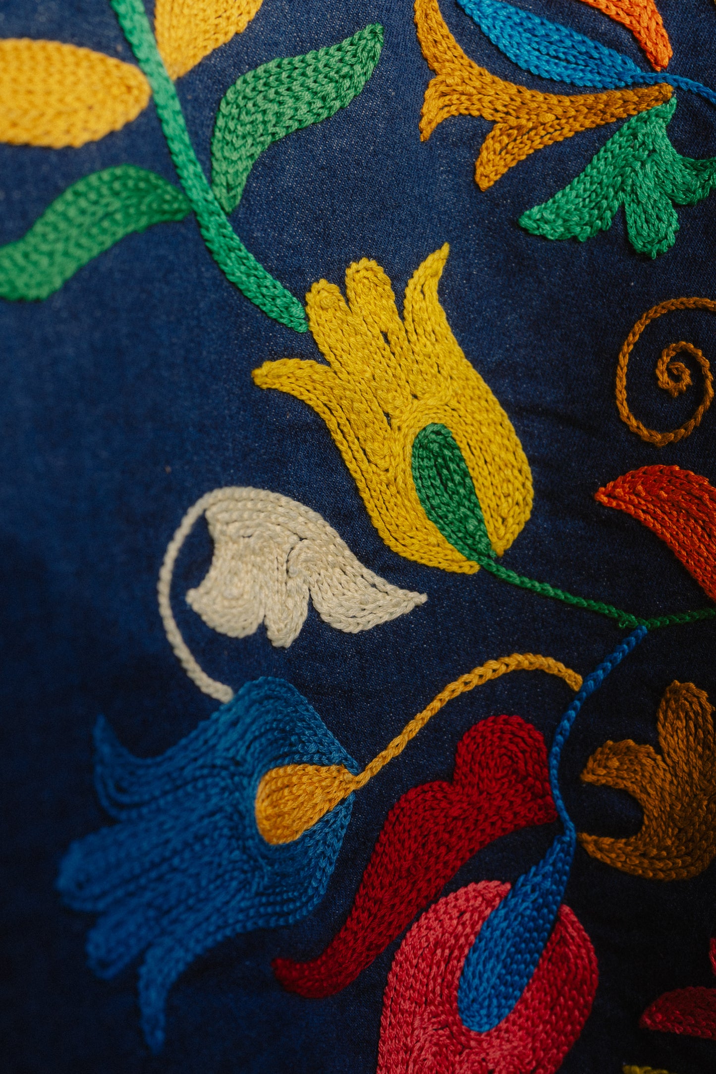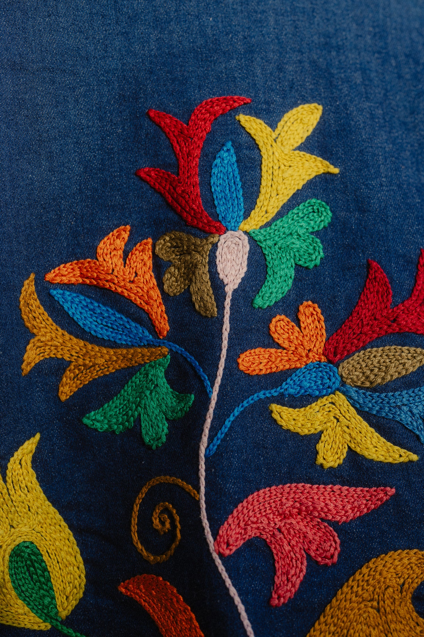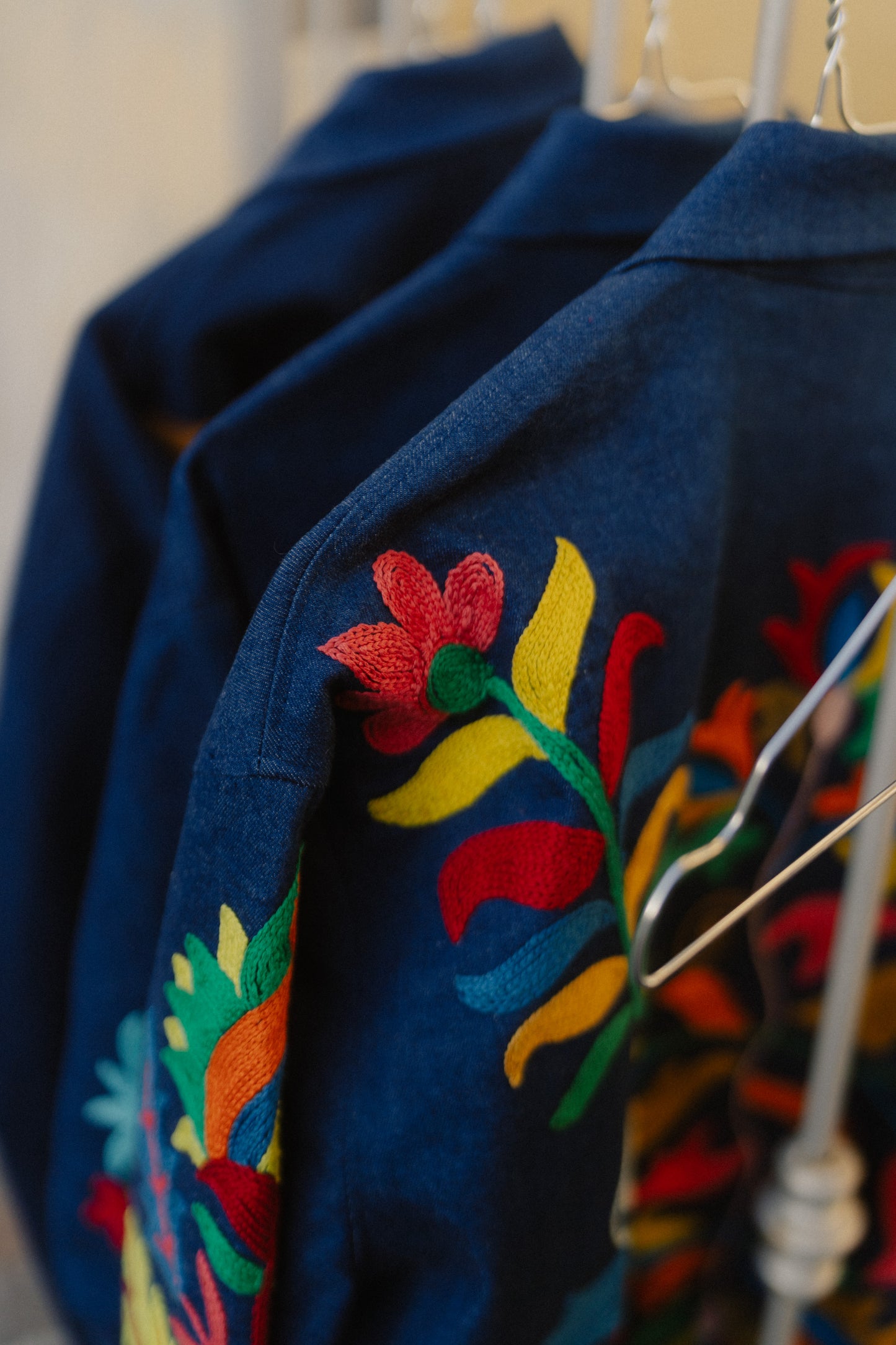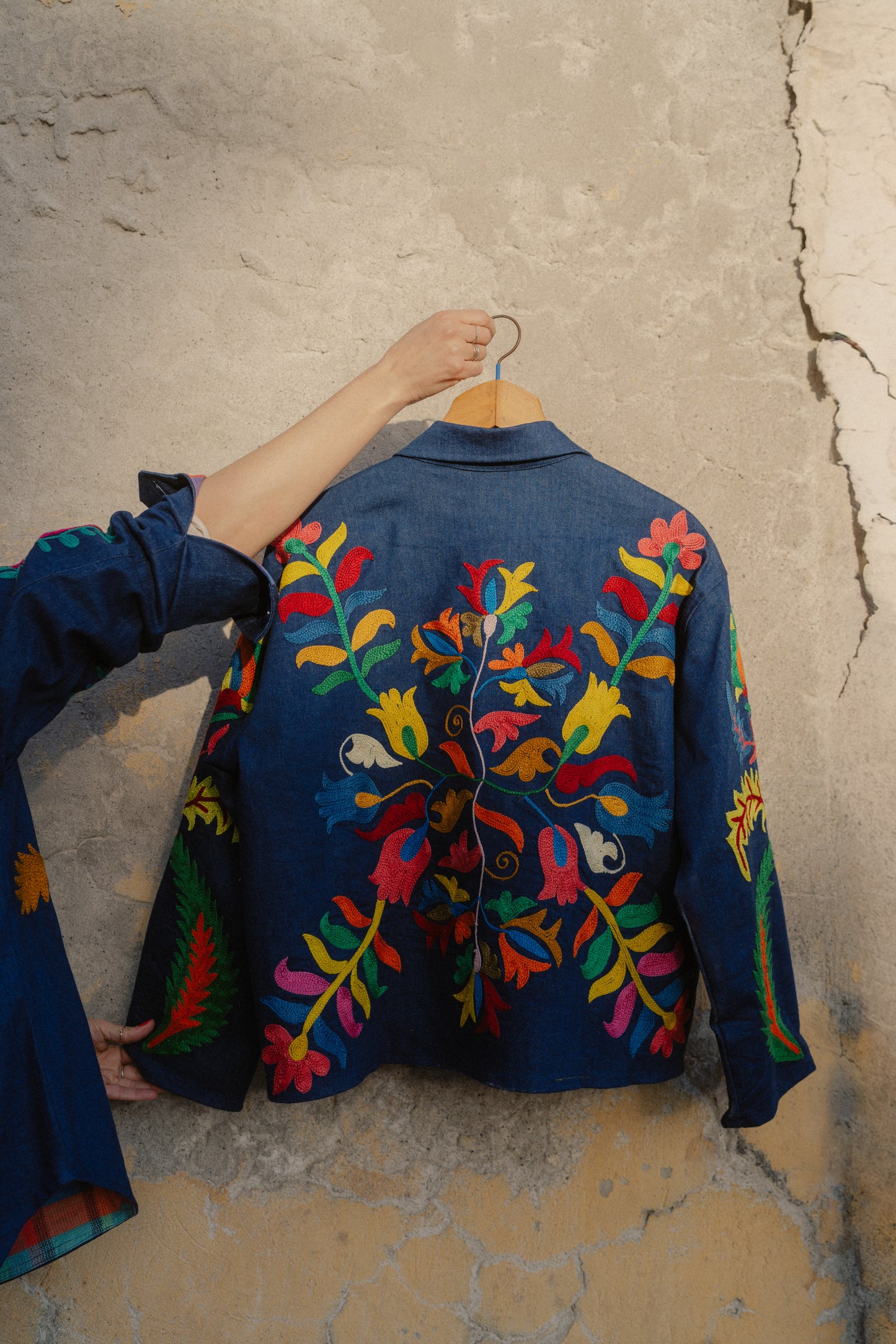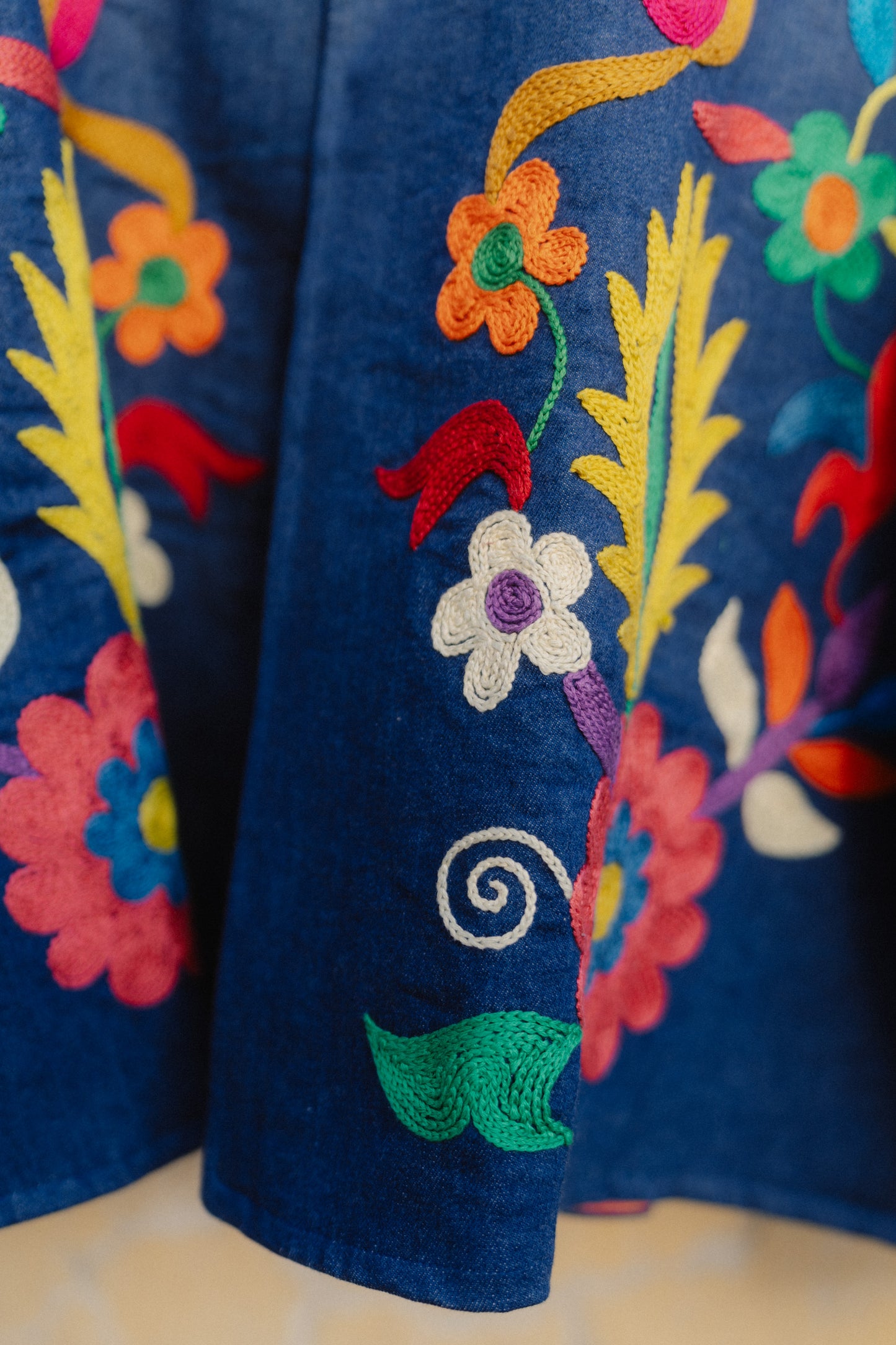 Giacchetta in jeans ricamato a mano con filo di cotone.